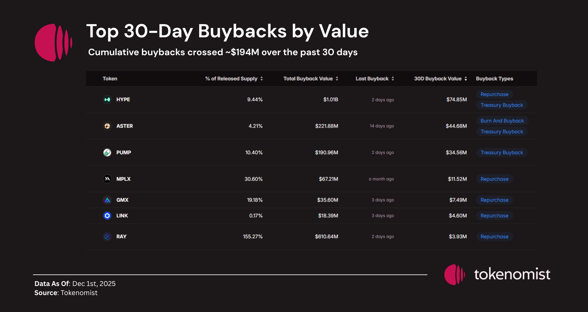 $HYPE led the market again with $74.8M in monthly repurchases, driven entirely by protocol fees. $ASTER and $PUMP followed with $44.7M and $34.5M, supported by a mix of treasury-funded and revenue-based buybacks. Mid-cap tokens like MPLX, GMX, LINK, and RAY posted steady but smaller repurchase flows, mostly sourced from protocol revenue. Overall, buybacks continue to act as one of the strongest supply-offset mechanisms across these ecosystems heading into December.