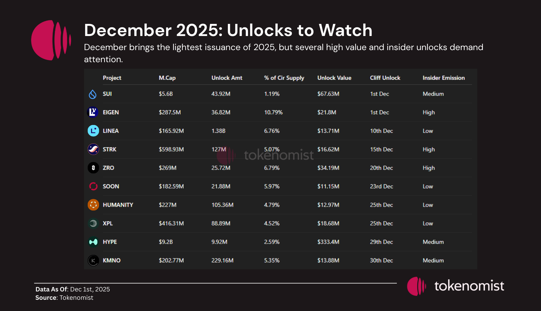 December may look quiet at the headline level, but HYPE, SUI, EIGEN, STRK, ZRO, and KMNO are the ones to watch — each with meaningful supply releases or high insider unlock components. Combined with multiple tokenomics updates and accelerating buyback programs, this month reflects a transitional phase heading into 2026, where supply-side pressure becomes increasingly influenced by protocol-level design changes rather than raw unlock volume.