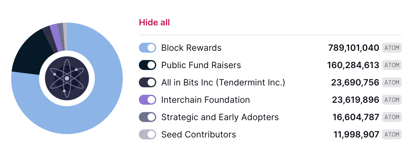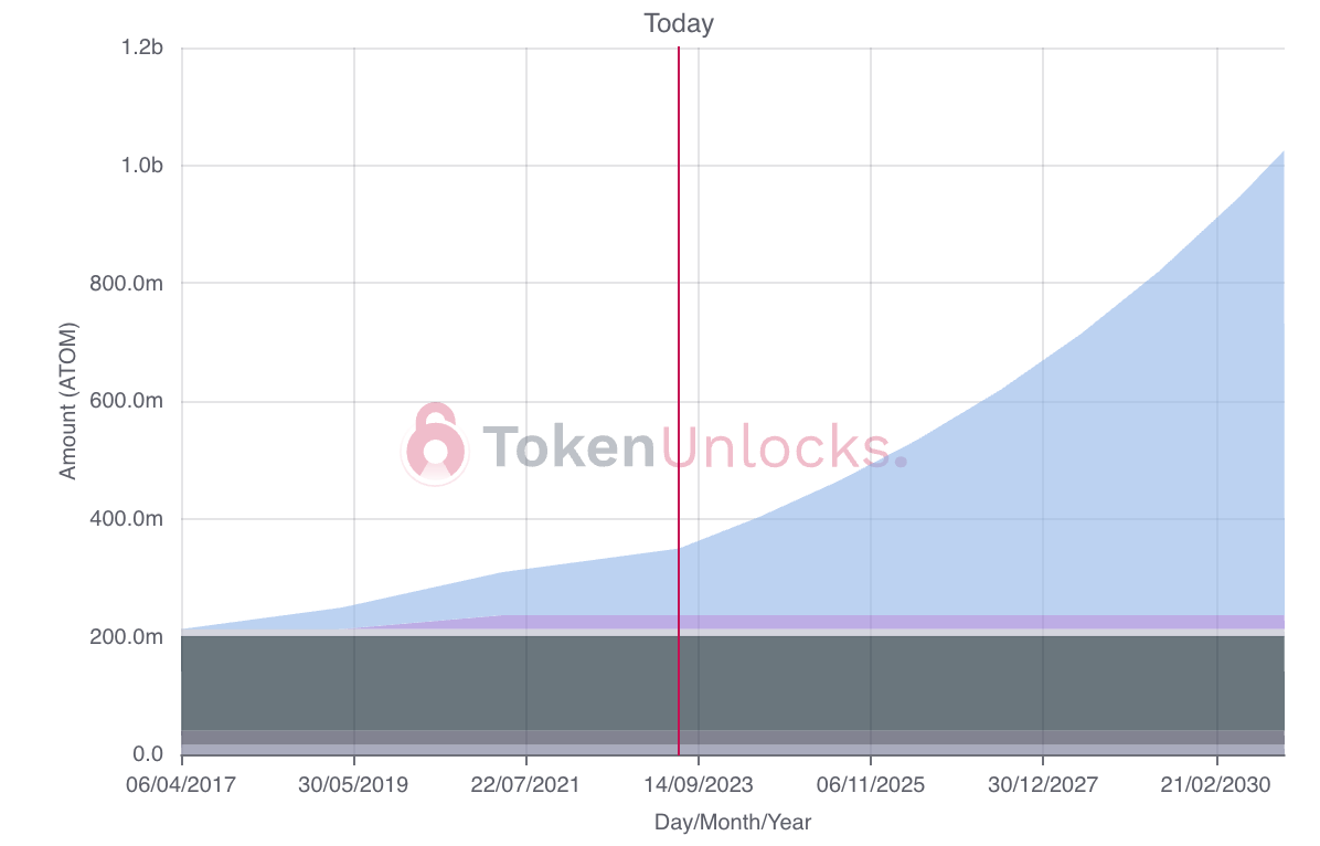 Following its launch in 2017, $ATOM has seen four out of six allocation parties become fully unlocked (Public Fund Raisers, All in Bits Inc (Tendermint Inc.), Strategic and Early Adopters, and Seed Contributors). The Interchain Foundation tokens were initially locked for a duration of two years, after which they linearly vested over an additional two-year period. At present, even the Interchain Foundation allocation has reached full unlock.
