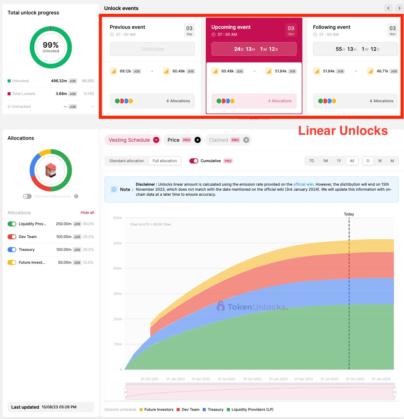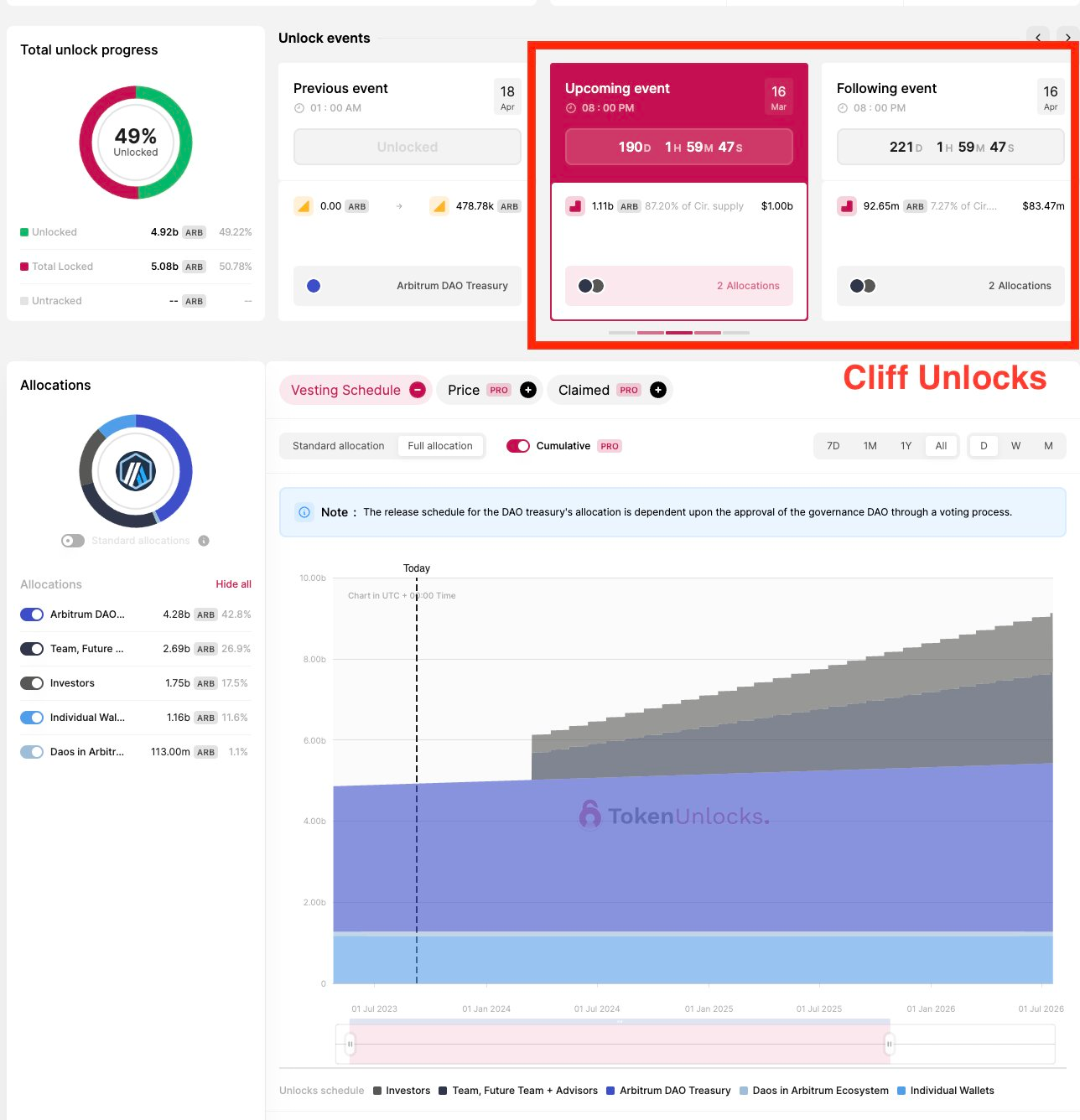 In each unlock event, TokenUnlocks calculates and displays the unlocked tokens as a percentage of the circulating supply. This helps with decision-making.