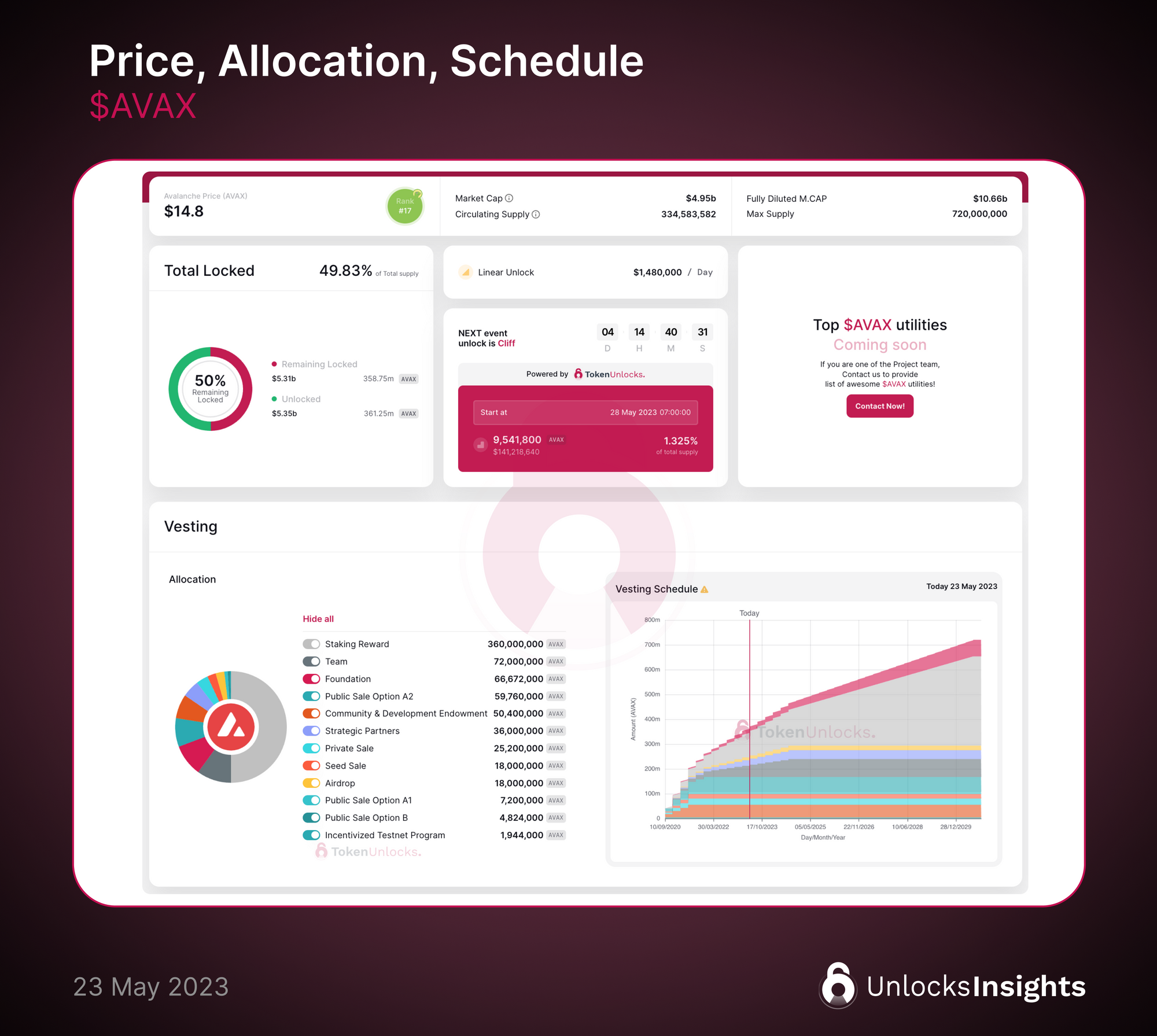 May 28, 2023, releasing 9.5m $AVAX or 1.32% of the total supply, valued at around $141m.