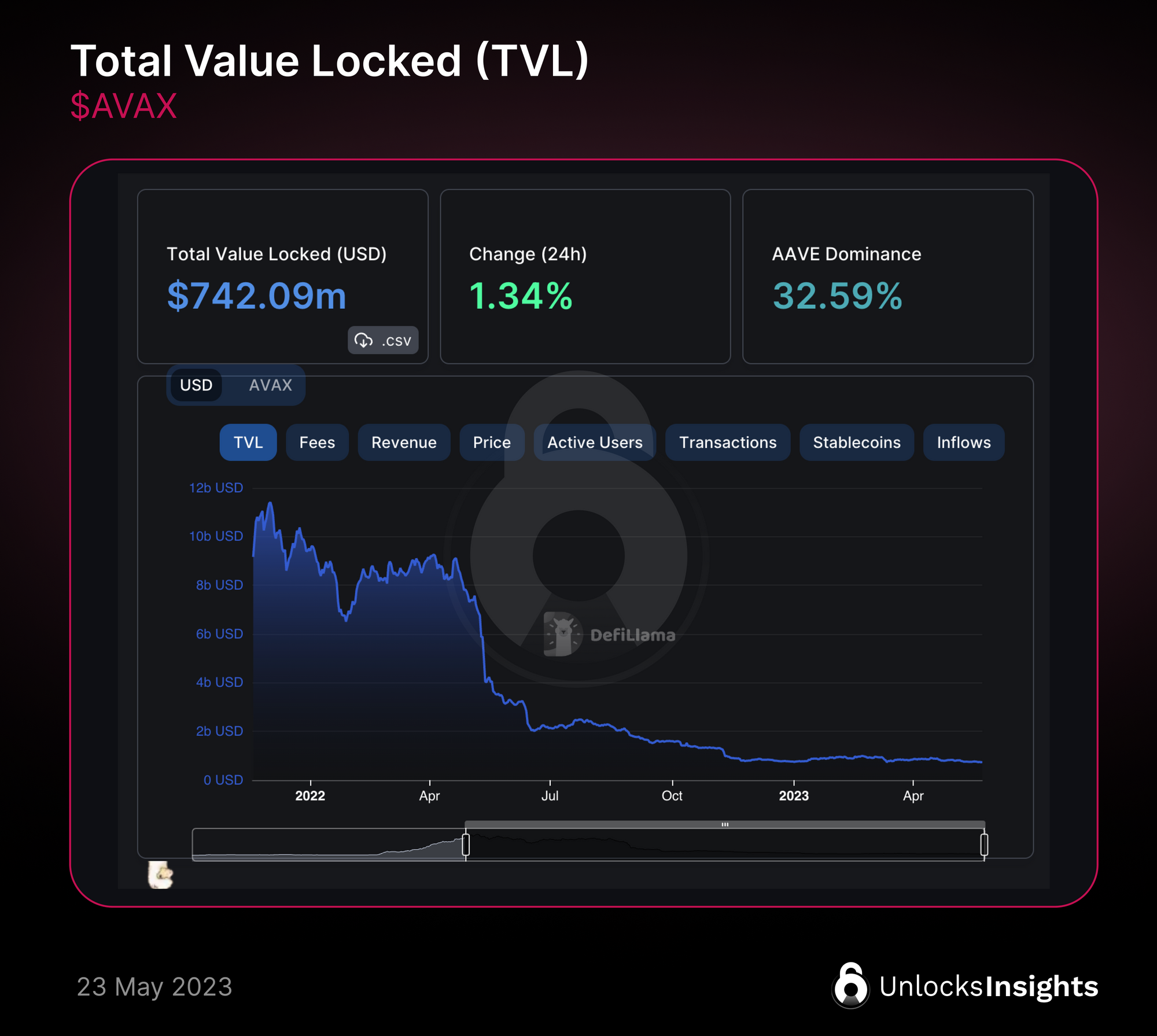 According to DefiLlama, Avalanche's TVL has remained relatively stable at around $700-900 million since November 2022, following a drop below $1 billion after Terra's collapse.
