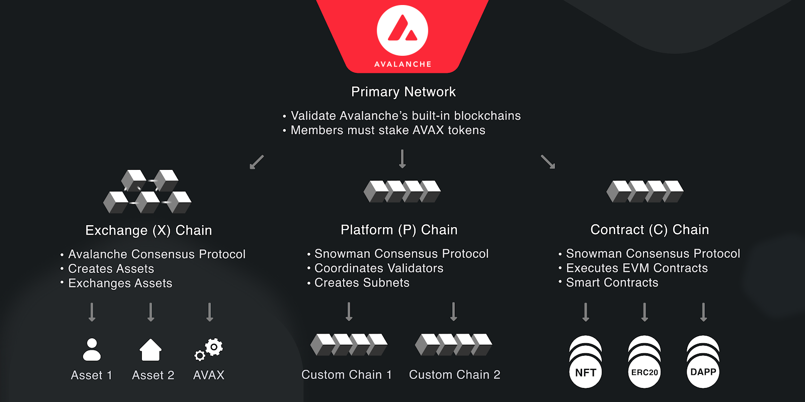 Avalanche's built-in blockchains—Exchange Chain (X-Chain), Platform Chain (P-Chain), and Contract Chain (C-Chain)—are validated by the Primary Network. All members of any Subnet must also be members of the Primary Network.