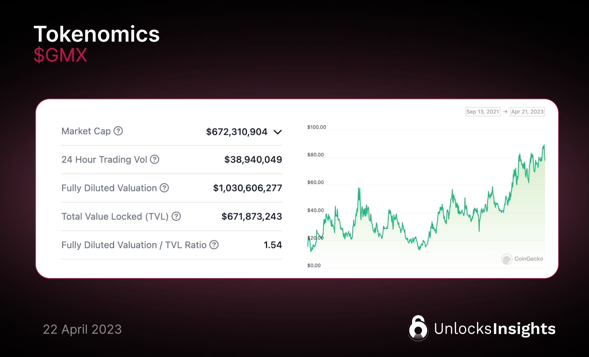 $GMX is the native token of the exchange, with an estimated total supply of 13,250,000 and around 65% currently in circulation. The token's price has been steadily increasing. (as of 22nd April 2023)