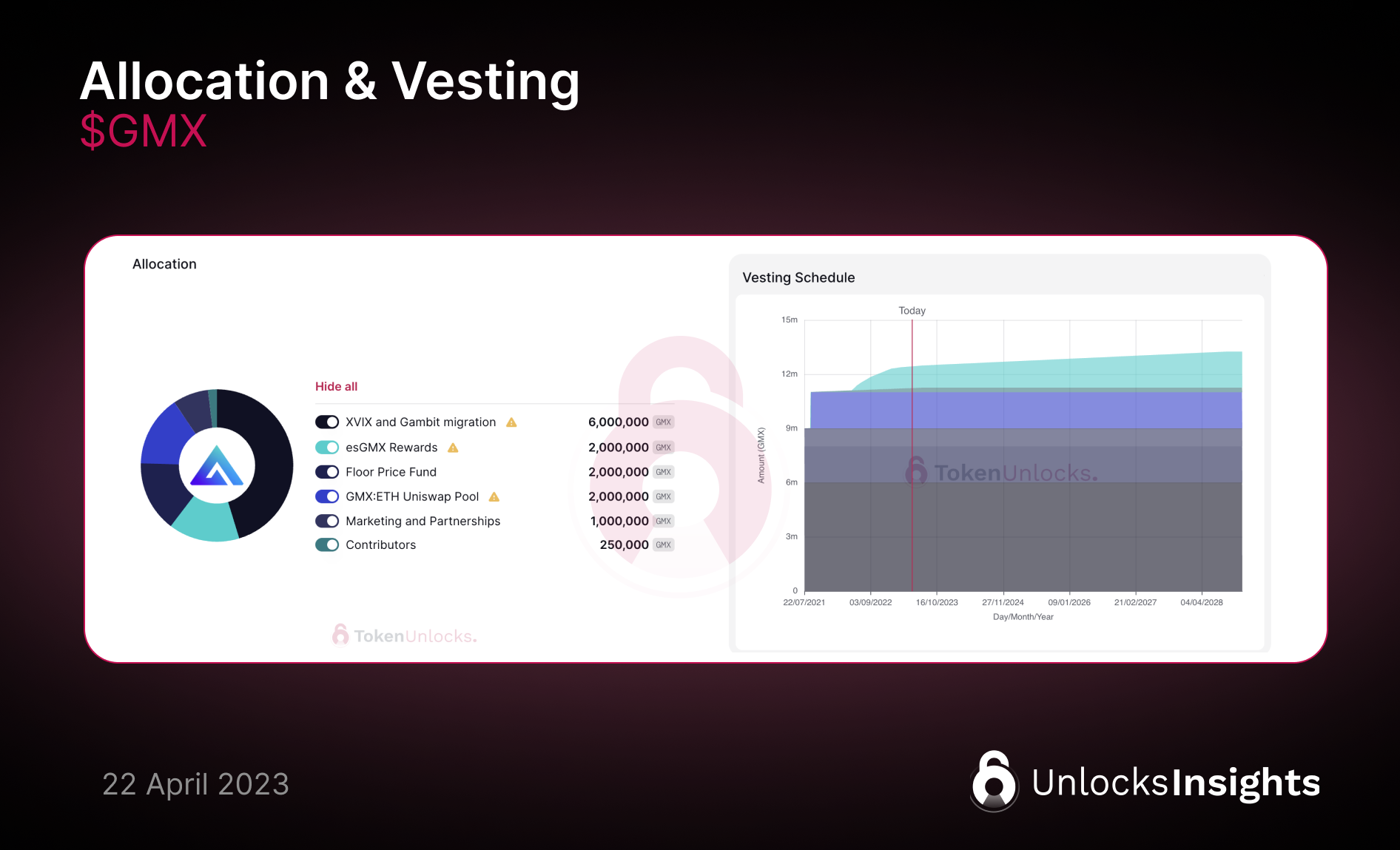 The $GMX supply is capped at 13.25 million tokens, with any minting beyond this subject to a 28-day time-lock and a governance vote.