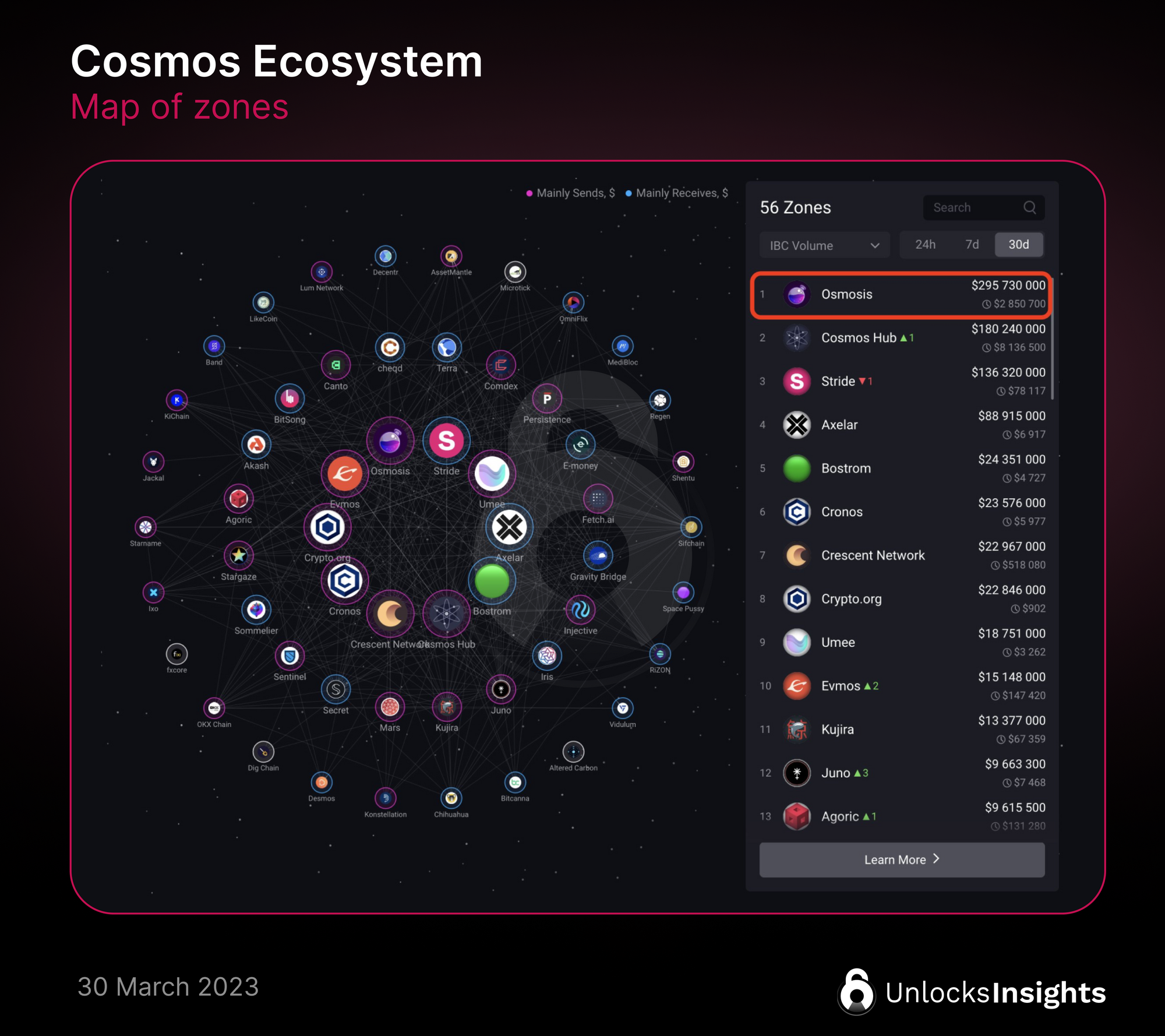 New to the Cosmos ecosystem? Osmosis is the first dApp (Zone) you need to know. It is the biggest DEX on the Cosmos Network, with its native token $OSMO enabling cross-chain trading via the IBC protocol. Osmosis has the most IBC volume and a fixed maximum supply of 1 billion tokens, aiming to incentivize long-term participation.