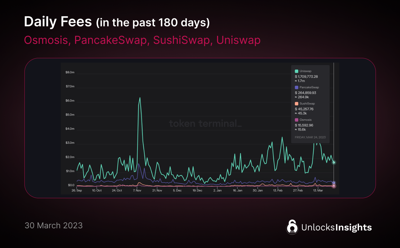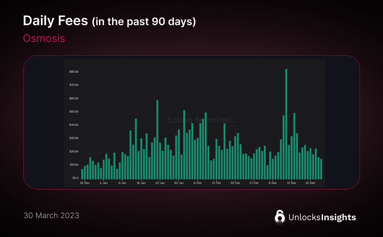 In the last 90 days, daily trading fees on Osmosis have been approximately $20k, with a peak of $80k on March 11th due to the depegging of $USDC. However, when compared to other major DEXs like SushiSwap, Osmosis still lags behind in terms of trading volume and fees generated.