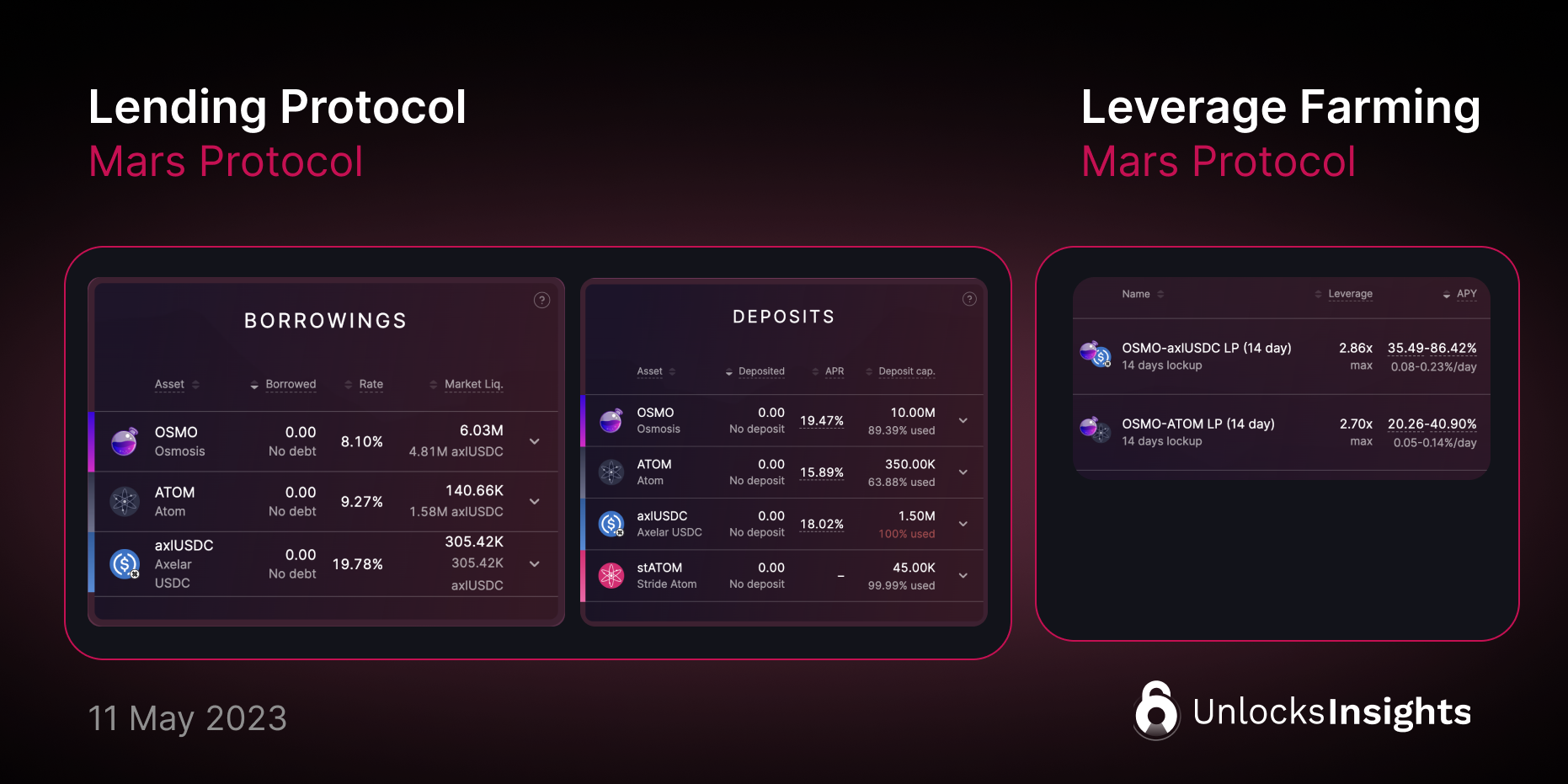 Mars Protocol is a lending service built on top of Osmosis, originally launched on Terra before moving to Osmosis after the collapse of Terra. In addition to lending services, Mars Protocol also offers leverage farming with attractive returns, allowing users to maximize their yields by leveraging their deposited assets to earn additional rewards.