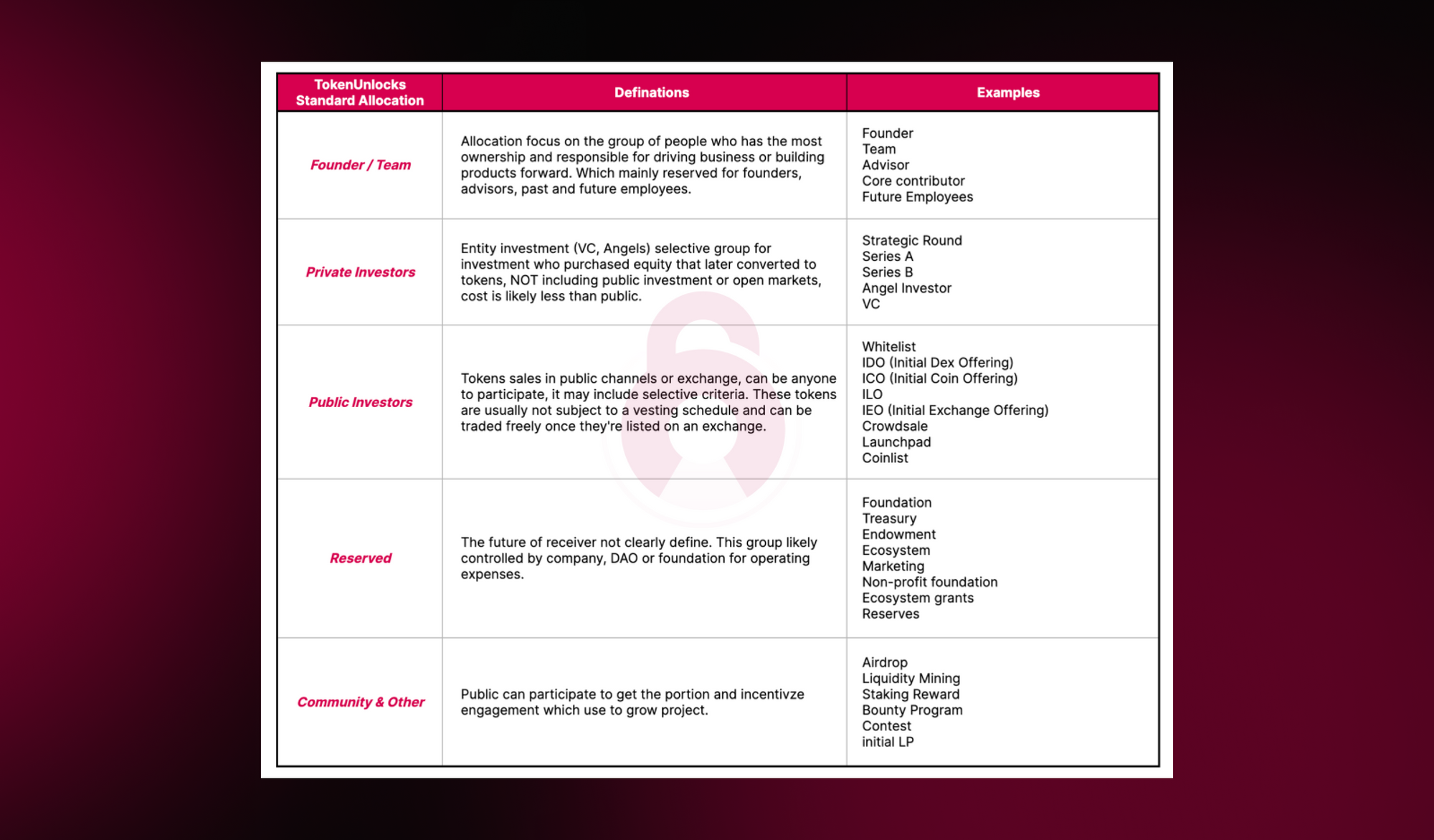 Say goodbye to time-consuming comparison processes. Our newly introduced standard allocation cuts down the complexity, making it simpler for you to compare allocations across different tokens or projects. TokenUnlocks' standard allocation comprises 5 major categories.