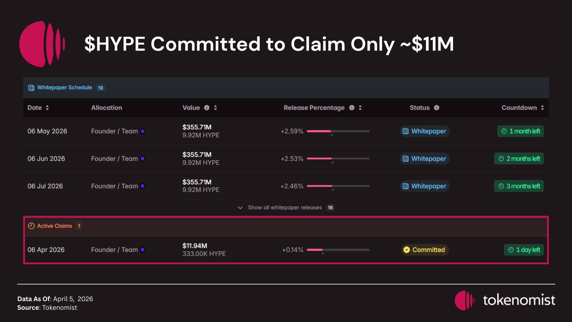 - $HYPE's April 6 unlock carries a $355M whitepaper figure, but the Hyperliquid team's commitment to claim only ~$11.94M (3.4% of the paper amount) is consistent with their historical practice of actively managing supply overhang.