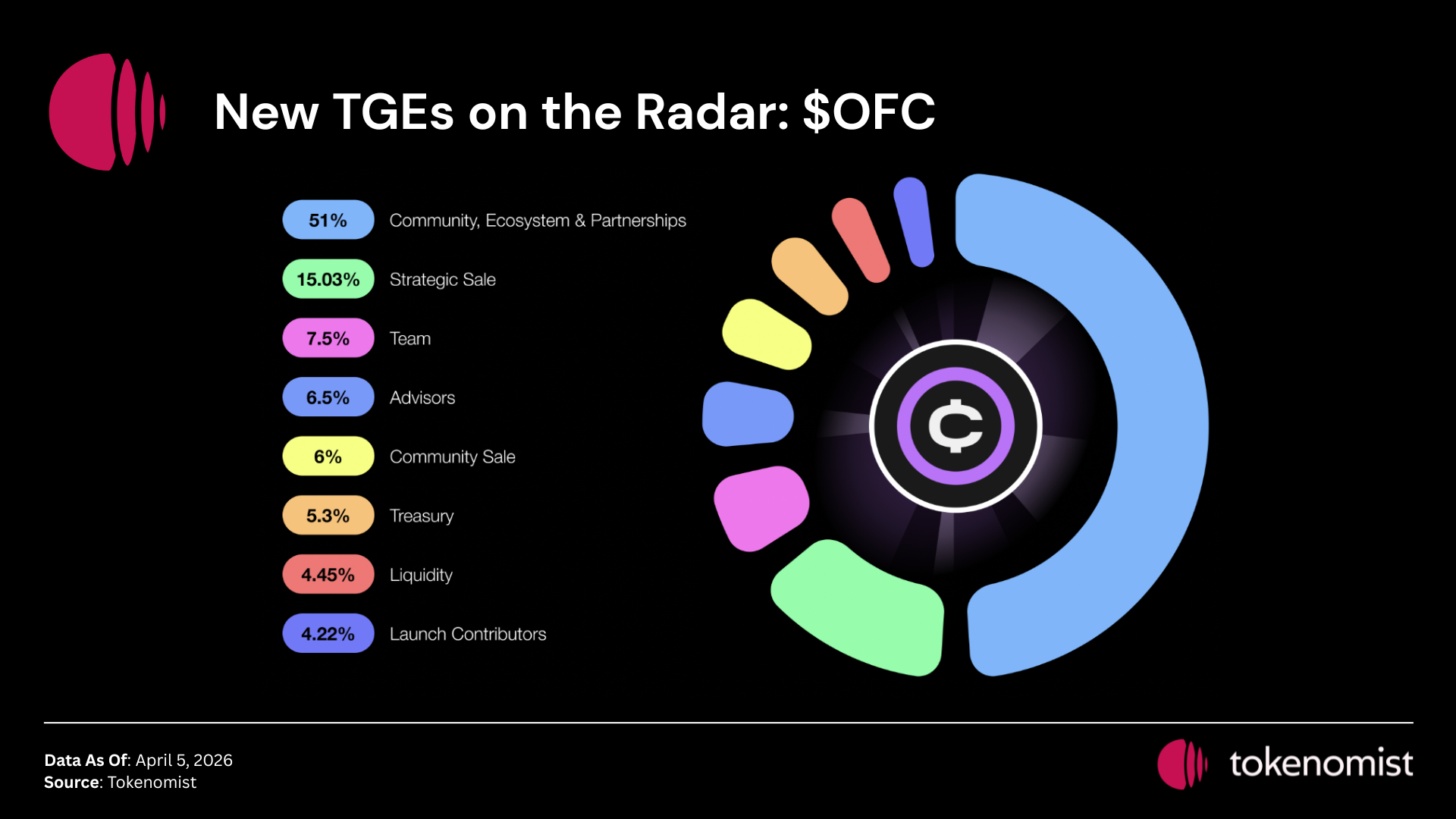 - $OFC's TGE on April 9 stands out for its community-heavy allocation (51% to ecosystem/partnerships) and strategic timing ahead of a World Cup catalyst, though the 15% strategic investor allocation with likely short-term vesting warrants watching.