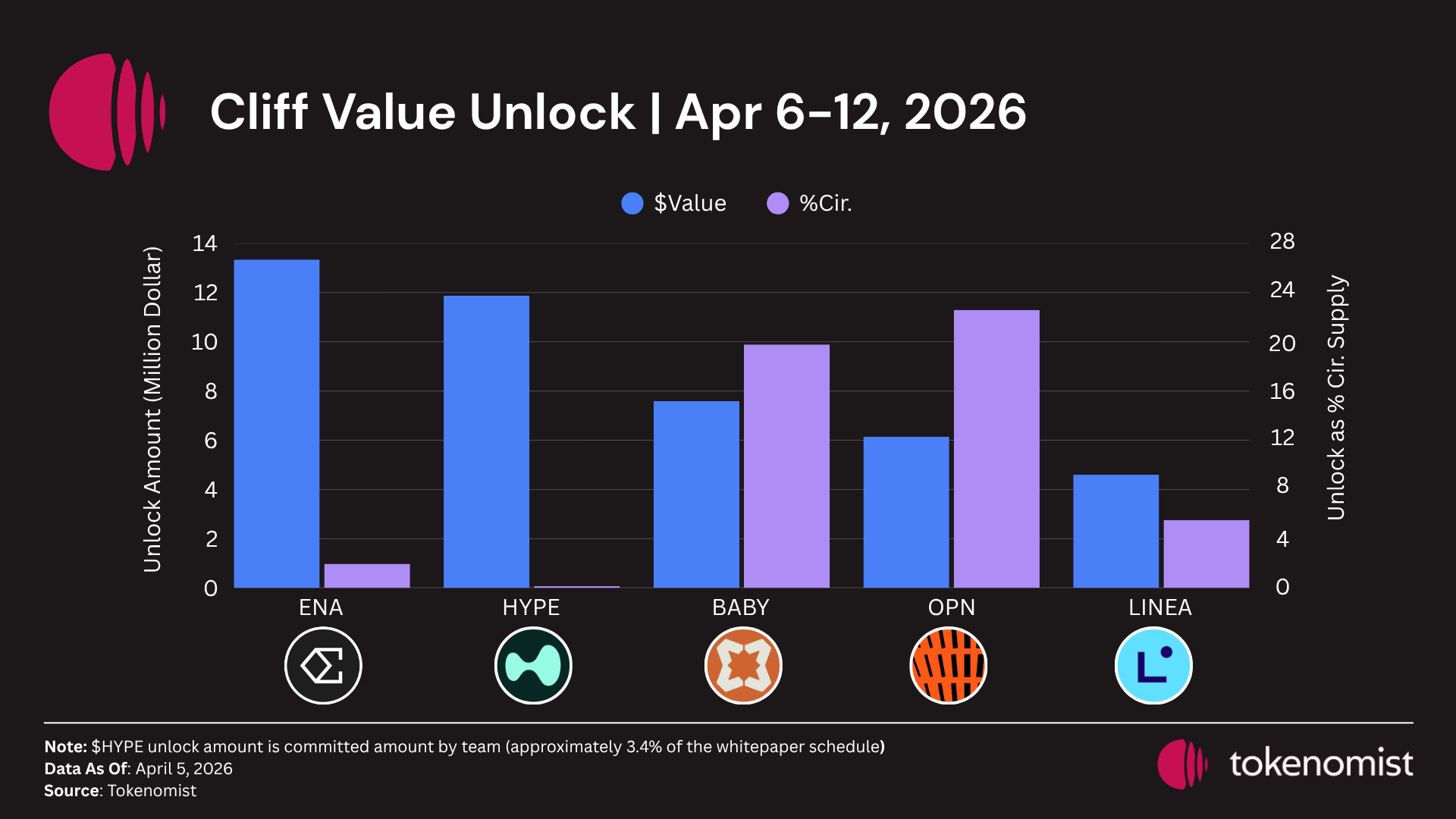 Next week’s scheduled token releases are set to exceed $890 Million in total value. Top tokens facing the largest cliff unlocks next week include $ENA, $HYPE, $BABY, $OPN, and $LINEA.