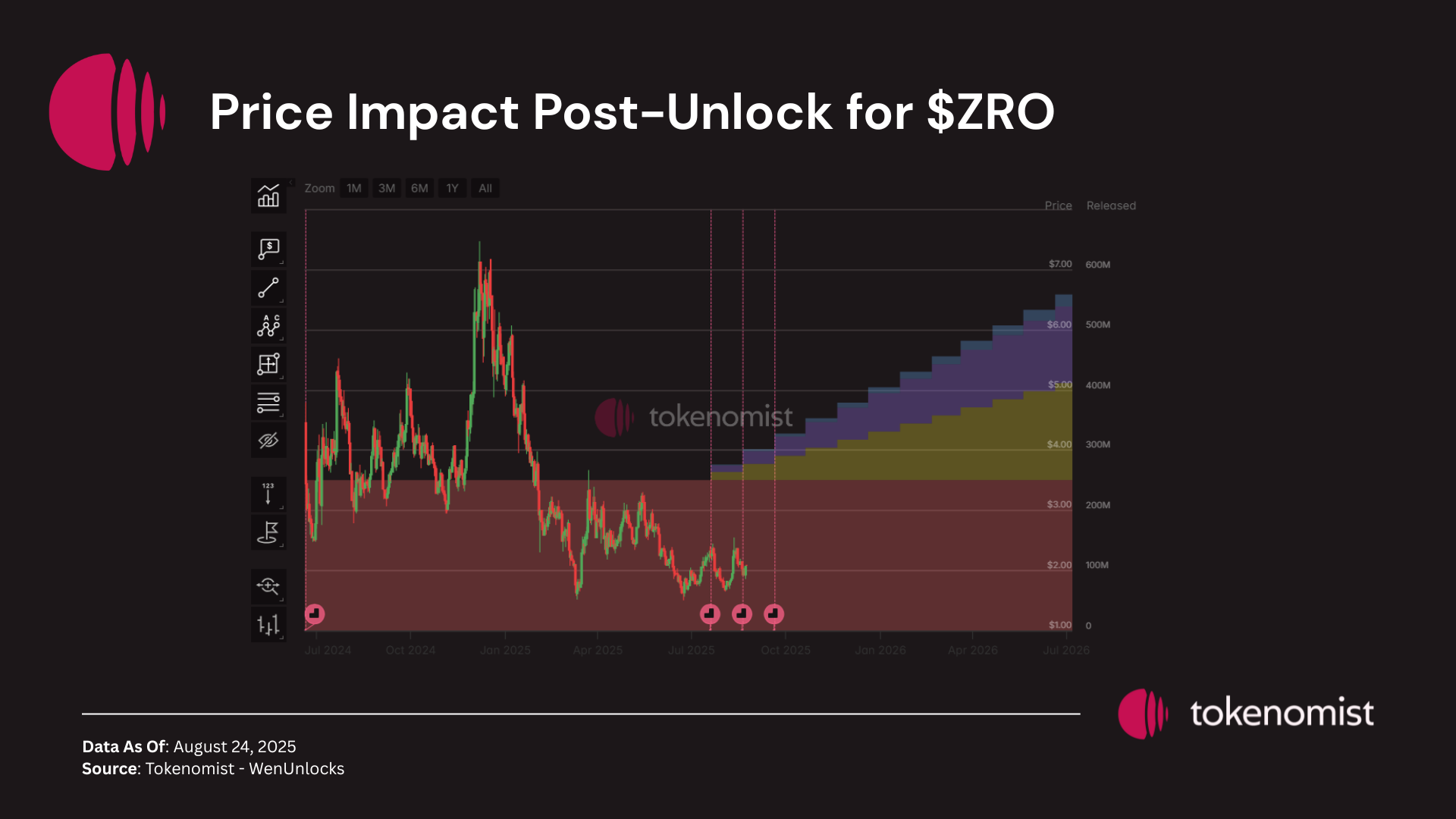 Last week’s largest unlock came from $ZRO, which saw notable sell pressure leading into the event. Even as the broader market rebounded on improving sentiment, $ZRO has struggled to recover, highlighting how heavy insider unlocks can weigh on short-term price action. While the current supply overhang remains a challenge, sustained ecosystem growth or new catalysts could help the token stabilize over time.