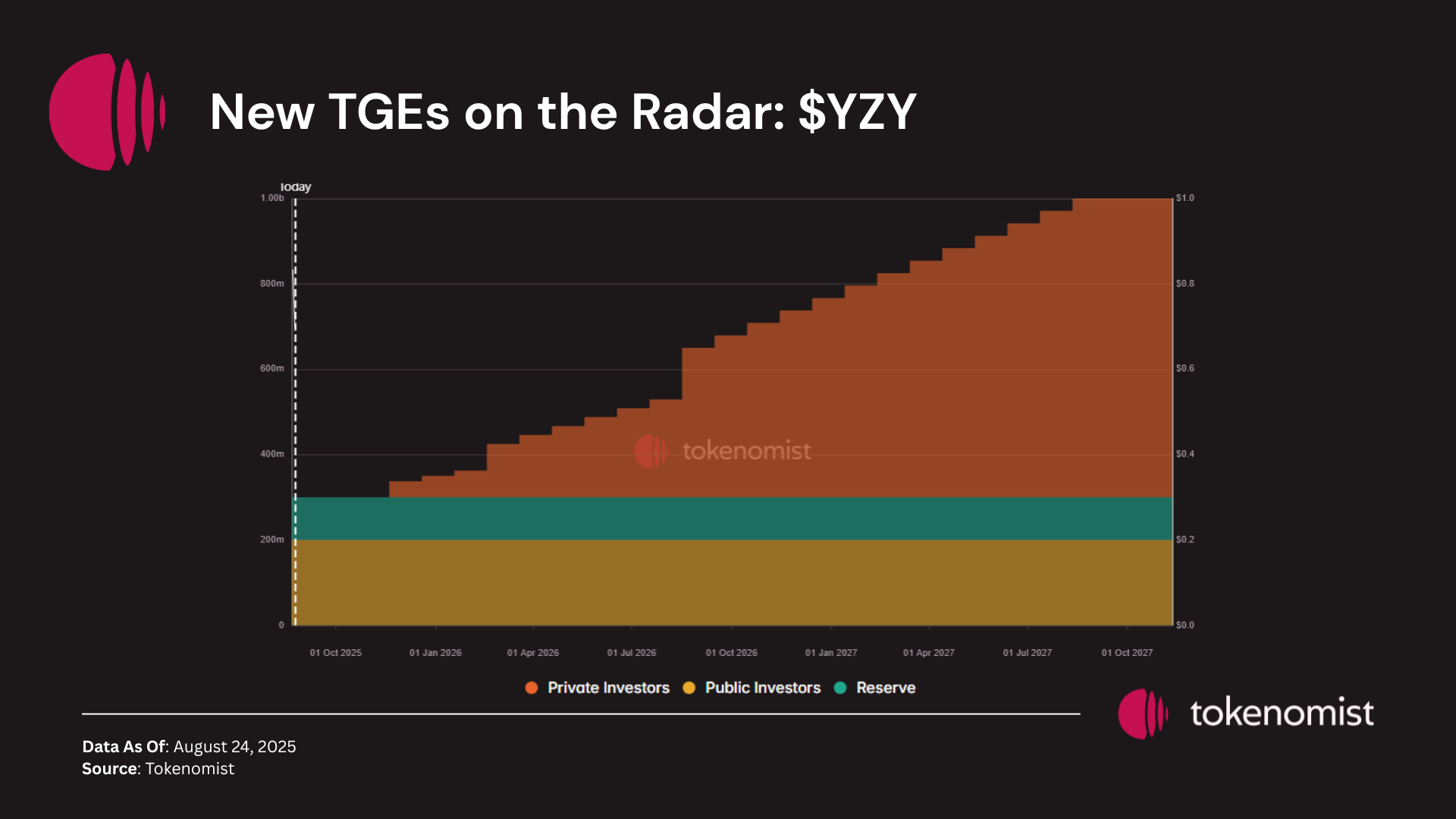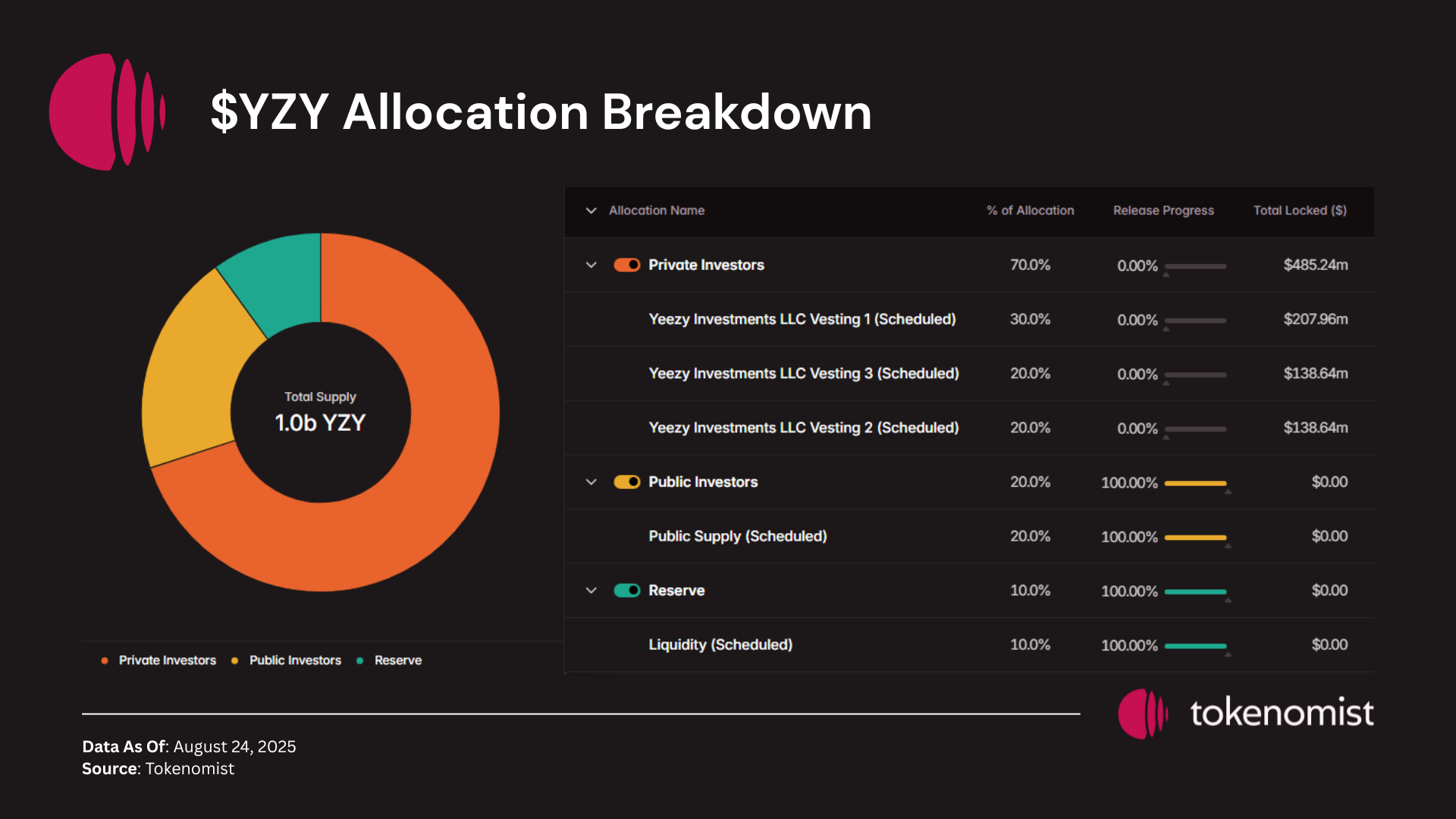 From a structural perspective, $YZY’s tokenomics are relatively simple, split into three allocations: private investors, public investors, and reserves. The first significant unlock for private investors is scheduled for November 2025, a timeline that leaves short-term price dynamics highly dependent on speculative momentum rather than structured release schedules.