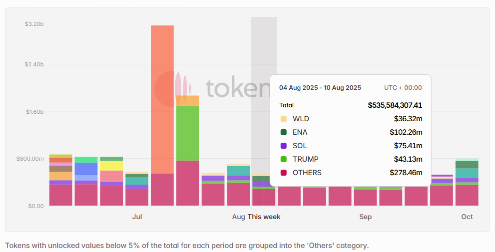 Next week’s scheduled token unlocks are set to exceed $535 Million in total value. Of this, approximately 18.7% is classified as insider unlocks under Tokenomist’s framework — referring to allocations designated for founders, core teams, or early investors. Notable tokens facing sizable releases by dollar value include $ENA, $SOL, $TRUMP, $WLD, and $MOVE.