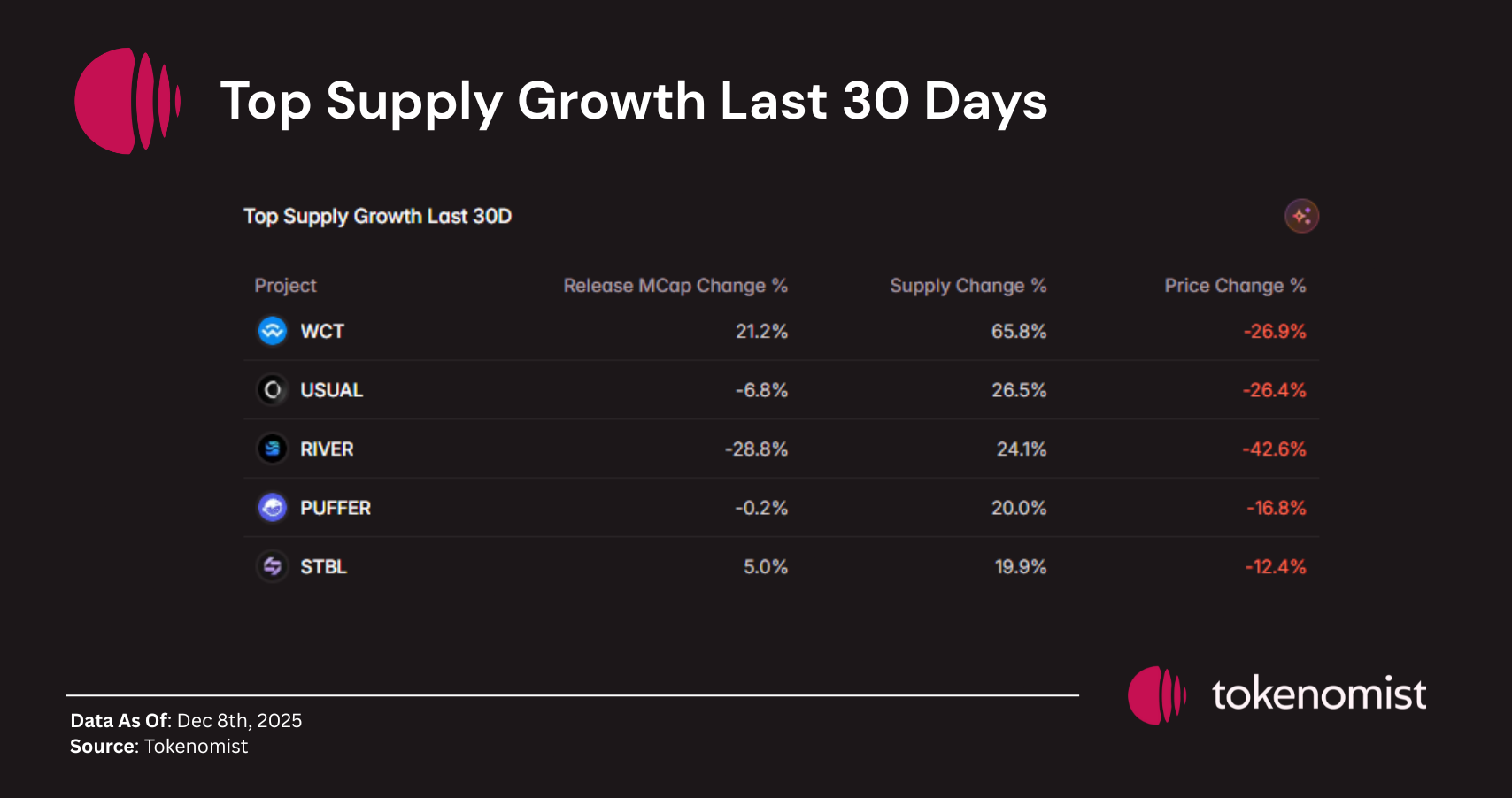 WCT, USUAL, RIVER, PUFFER, and STBL lead 30D supply expansion, posting 20–66% increases over the past month. Across this basket, price performance remains broadly negative, signaling that recent supply growth has been driven primarily by vesting-related emissions rather than organic demand.