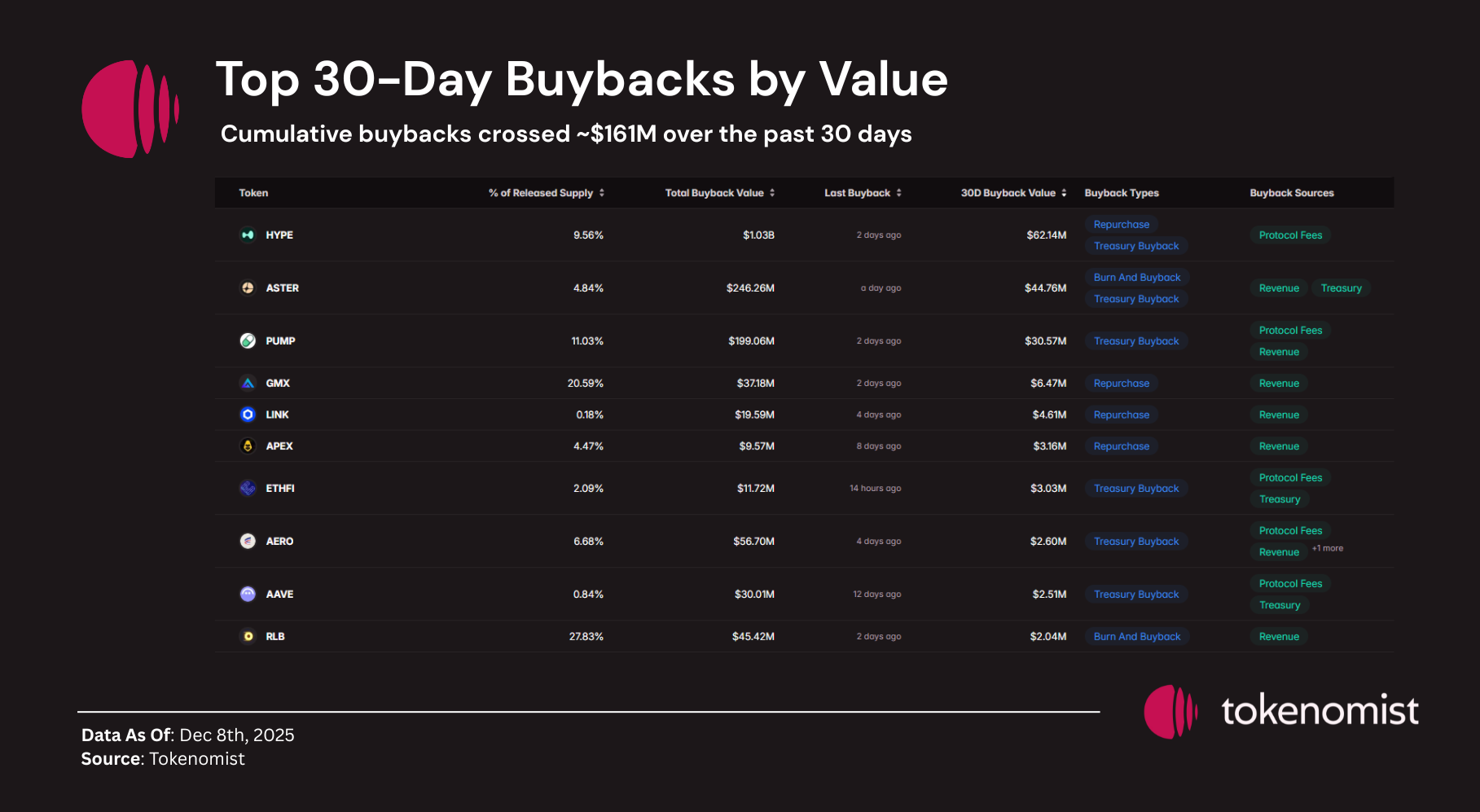 Cumulative 30D buyback activity exceeded $190M across major tokens.
