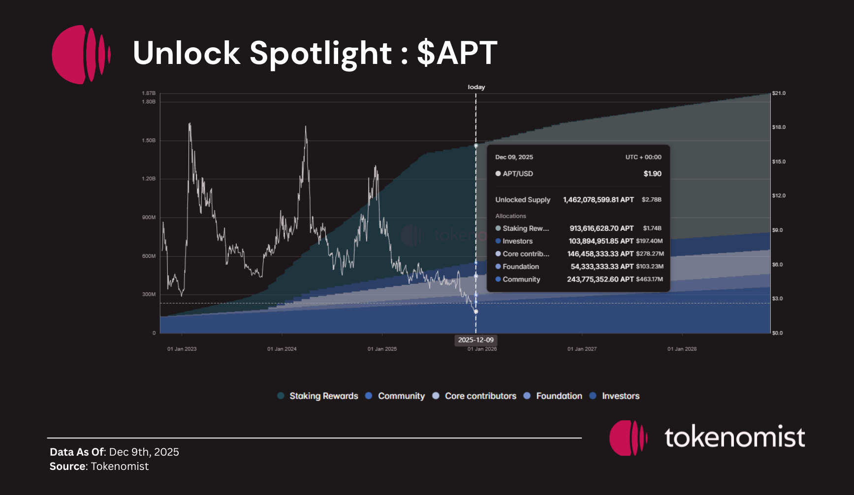 $APT follows a monthly unlock schedule with around 60% of the supply already unlocked. The remaining insider allocations will vest over the next 2–4 years, while inflation rewards are expected to remain the main source of emissions going forward.