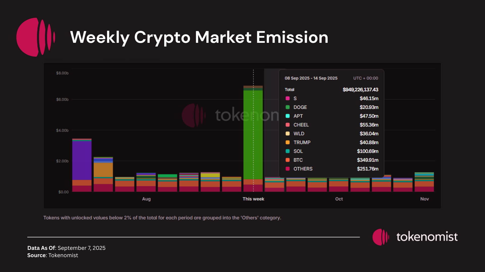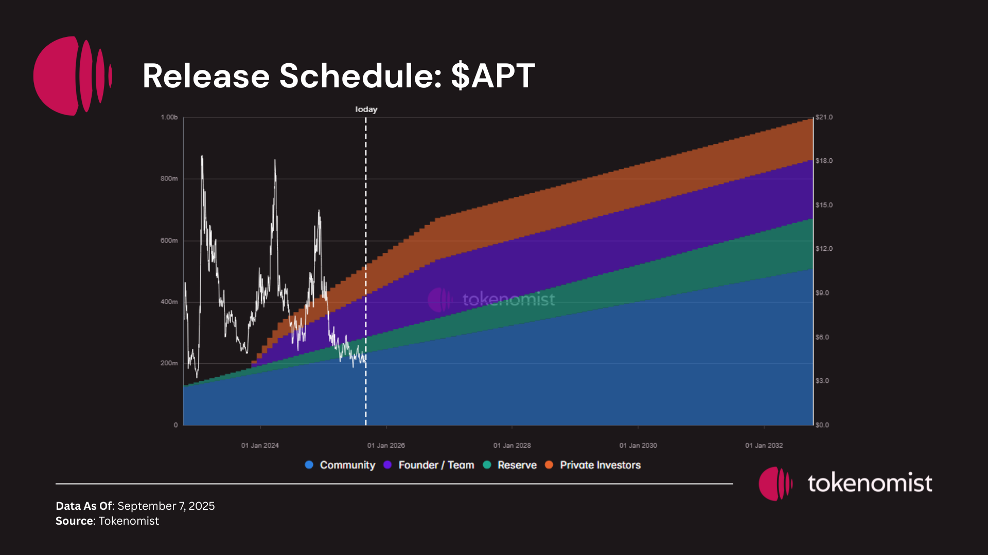 $APT leads this week with the largest unlock by dollar value, with the majority of tokens released to insider allocations. Despite broader market resilience, APT’s price action remains underwater, reflecting persistent supply overhang and limited near-term demand to absorb the new emissions.