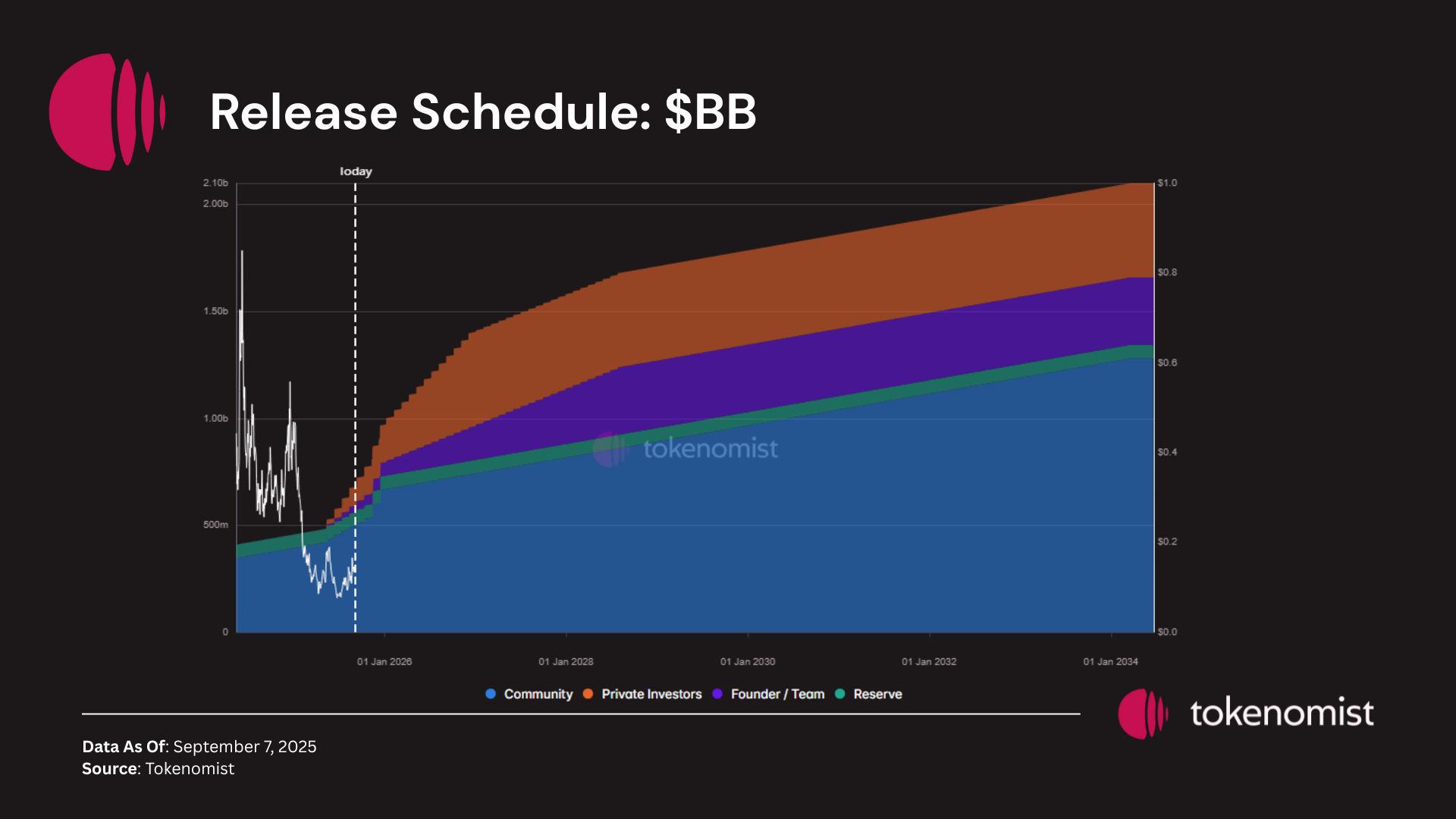 $BB posted the week’s largest unlock relative to circulating supply, with allocations split between insiders and the community. However, with momentum in the BTCfi sector largely faded, BB’s price action has struggled to recover.