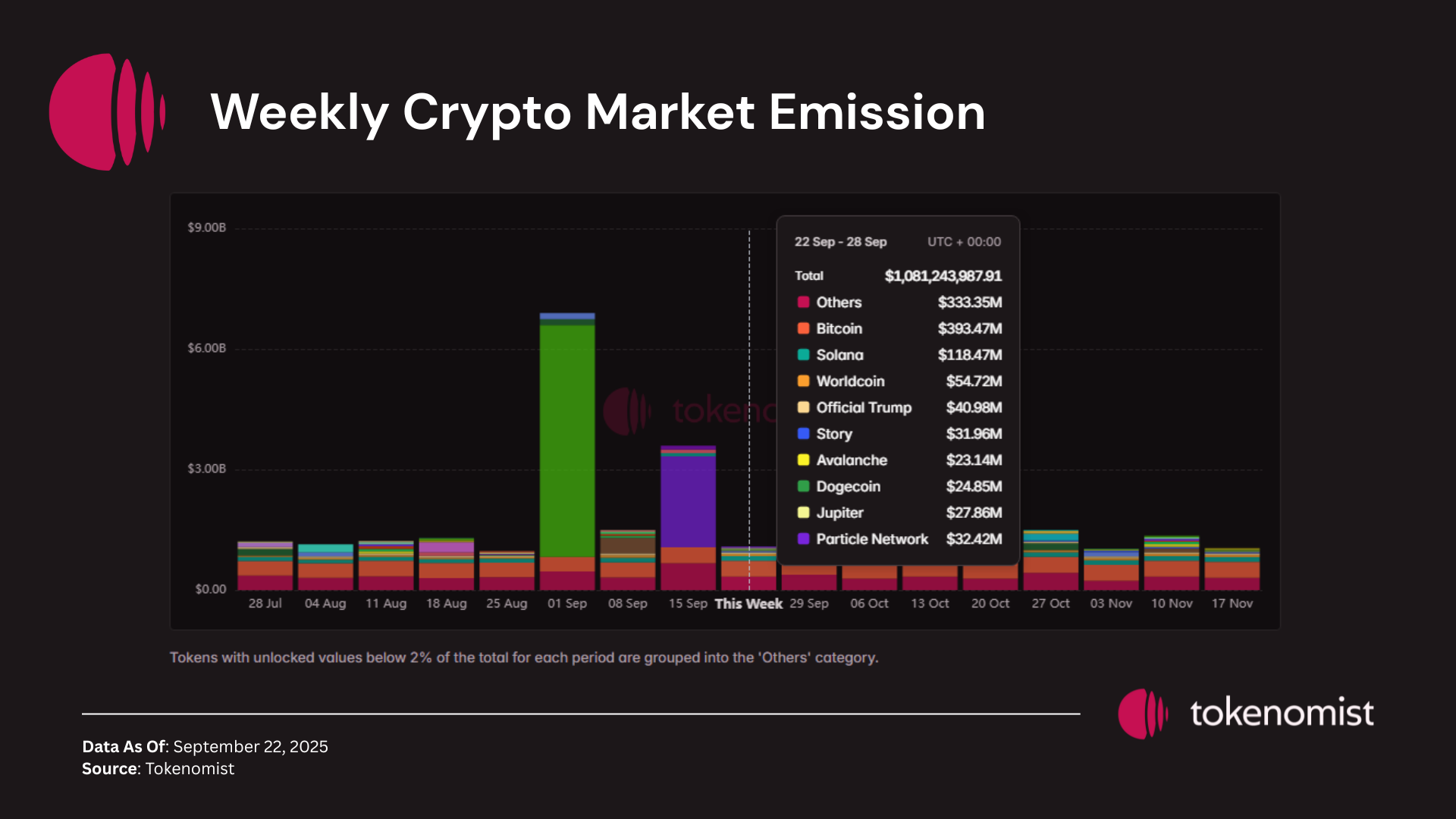Next week’s scheduled token releases are set to exceed $1 Billion in total value. Notable tokens facing sizable releases by dollar value include $BTC, $SOL, $WLD, $TRUMP, and $PARTI.