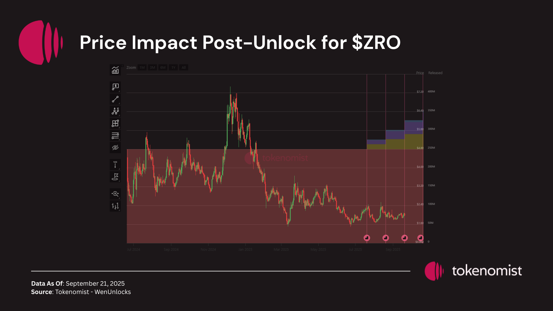 Last week’s largest unlock came from $ZRO, with most tokens released to insider allocations, including strategic partners and core contributors. The token continues to face headwinds as supply overhang weighs on price, leaving it near all-time lows despite improving macro sentiment.