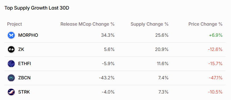 Tokens with high emissions continue to struggle as fresh demand remains absent from the market. Many of these projects are not only facing price declines but also seeing their market capitalizations fall — a concerning sign given their growing token supply. This suggests that even as more tokens enter circulation, investor interest isn’t keeping pace, amplifying downward pressure across these names.