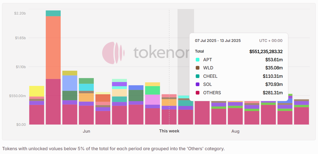 Next week’s scheduled token unlocks are set to exceed $550 Million in total value. Of this, approximately 10% is classified as insider unlocks under Tokenomist’s framework — referring to allocations designated for founders, core teams, or early investors. Notable tokens facing sizable releases by dollar value include $CHEEL, $SOL, $APT, and $WLD.