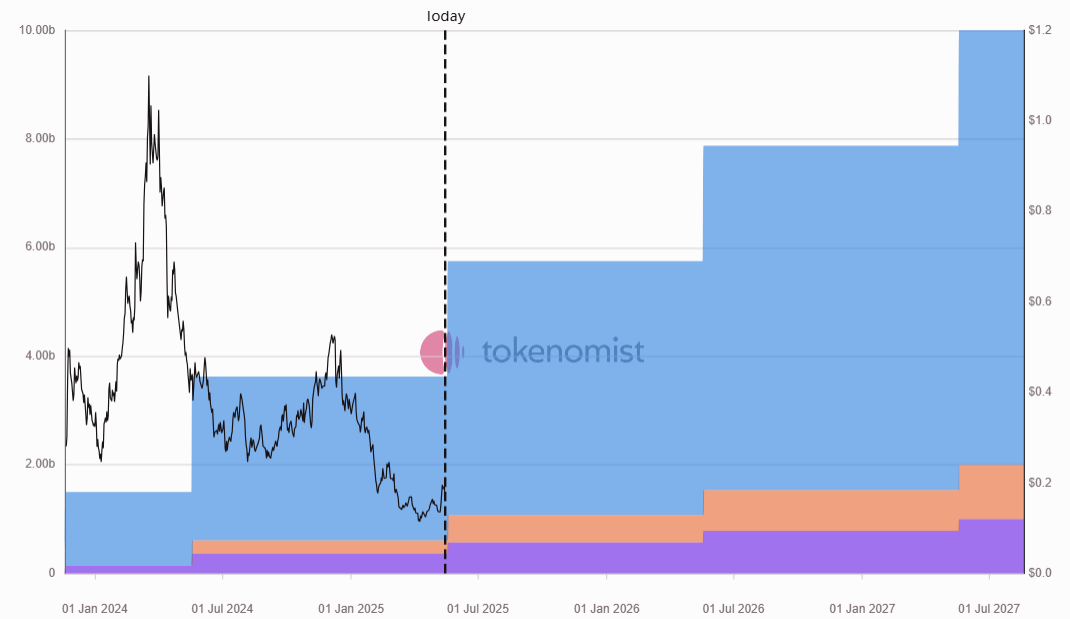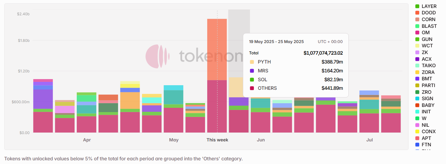 Next weekβs scheduled token unlocks are set to surpass $1 Billion in total value. Of this, approximately 8% is classified as insider unlocks under Tokenomistβs framework β referring to allocations designated for founders, core teams, or early investors. Notable tokens facing sizable releases by dollar value include $PYTH, $MRS, $SOL, $PIXEL, and $EIGEN