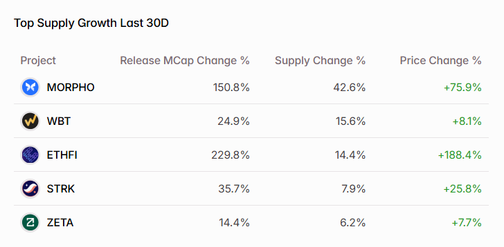 Among tokens with the highest supply growth over the past 30 days, $ETHFI emerged as the top performer. Its price rally aligned with Ethereumβs rebound, but the momentum was also fueled by strong fundamentals and growing attention on crypto Twitter. Influential figures like Arthur Hayes have discussed the project positively, and the recent launch of ETHFIβs crypto credit card β offering 2β3% cashback β added real-world utility to its ecosystem. Additionally, the introduction of a token buyback and burn mechanism has further strengthened its tokenomics, boosting investor confidence and driving sustained demand.