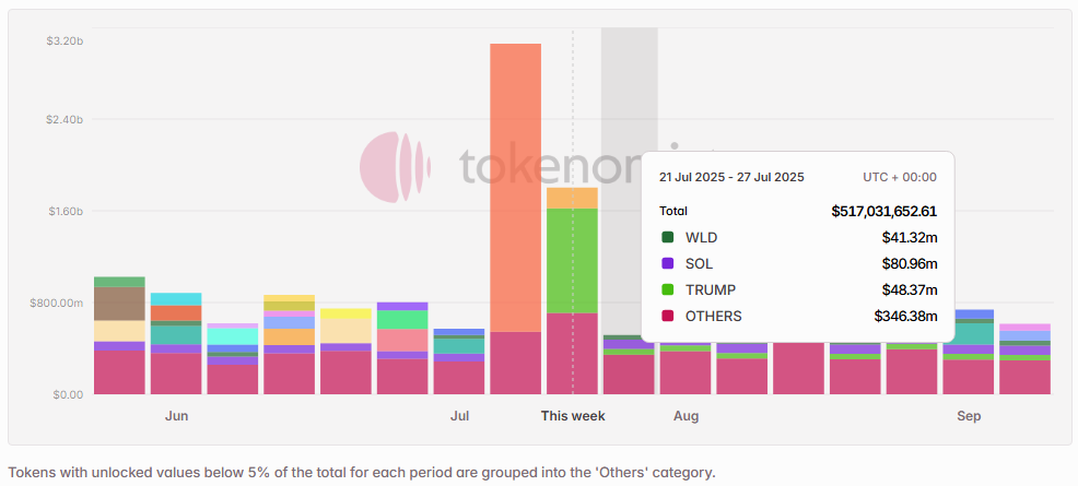 Next week’s scheduled token unlocks are set to exceed $510 Million in total value. Of this, approximately 5.31% is classified as insider unlocks under Tokenomist’s framework — referring to allocations designated for founders, core teams, or early investors. Notable tokens facing sizable releases by dollar value include $SOL, $TRUMP, $WLD, $AVAIL, and $VENOM.