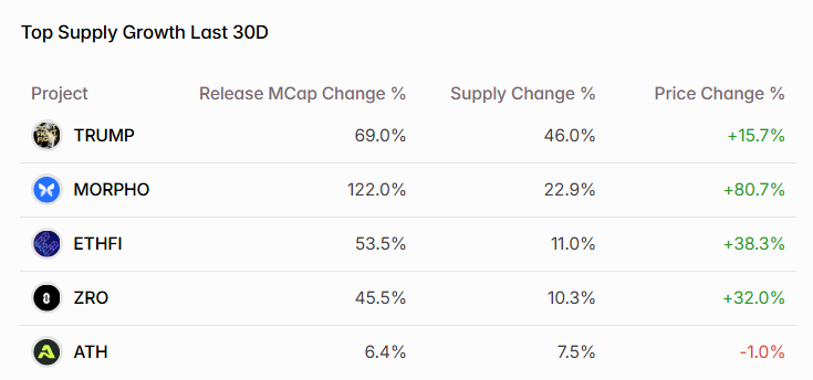 With bullish momentum continuing across the market, many tokens have managed to post strong gains despite undergoing significant unlocks over the past 30 days. This suggests that current market conditions are helping absorb supply-side pressure, reducing the typical negative impact of large token releases.