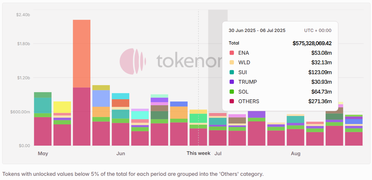 Next week’s scheduled token unlocks are set to be around $575 Million in total value. Of this, approximately 26% is classified as insider unlocks under Tokenomist’s framework — referring to allocations designated for founders, core teams, or early investors. Notable tokens facing sizable releases by dollar value include $SUI, $SOL, $ENA, $WLD, and $TRUMP.