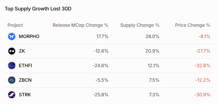 Tokens with high supply growth over the past 30 days continue to underperform. In the absence of strong narratives to drive demand, many of these tokens struggle to find support. With token transparency becoming an increasingly discussed topic in the industry, tokenomics remains a key factor investors are watching closely — especially as more projects face growing scrutiny over unlock schedules and allocation practices.
