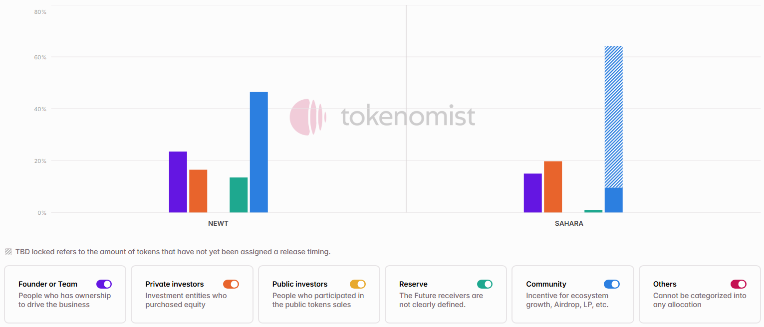 From a tokenomics perspective, $SAHARA launched with a very low float — just 7% of the total supply unlocked — fitting the typical low float, high FDV model. In contrast, $NEWT debuted with a moderate 30% initial supply, offering slightly more immediate liquidity. While SAHARA allocates a larger portion to the community, a majority of that allocation remains TBD, leaving questions about future distribution and sell pressure.