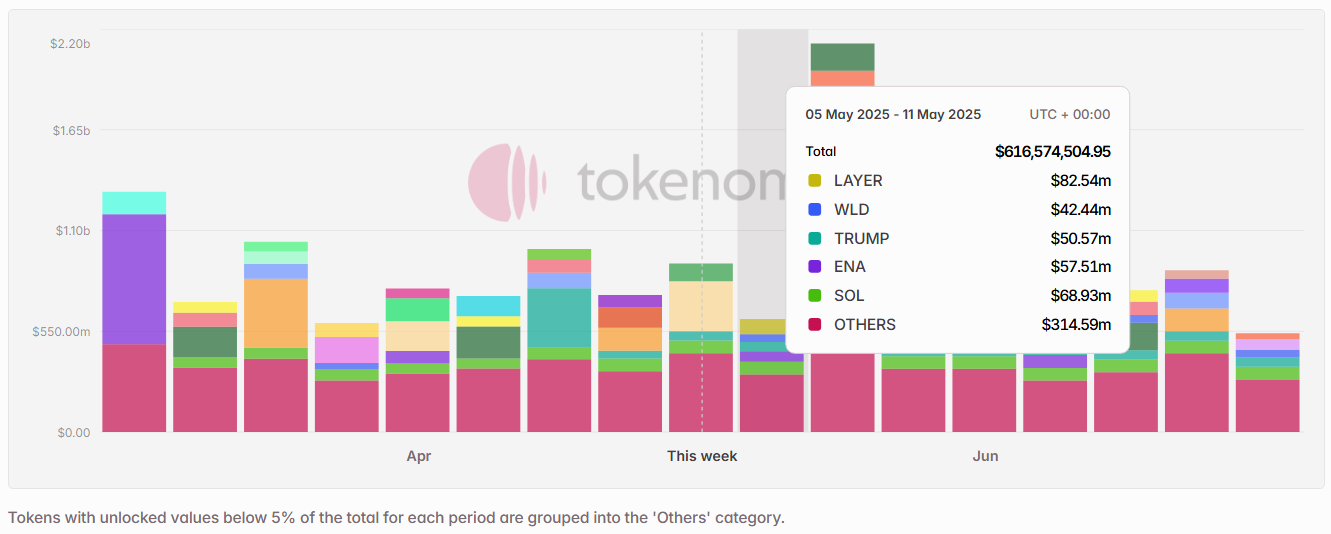 Next week’s scheduled token unlocks are set to surpass $600 million in total value. Of this, approximately 13% is classified as insider unlocks under Tokenomist’s framework — referring to allocations designated for founders, core teams, or early investors. Notable tokens facing sizable releases by dollar value include $LAYER, $SOL, $ENA, $TRUMP, and $WLD.