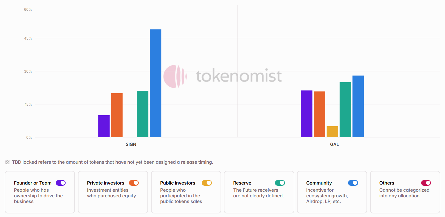 This indicates that $SIGN follows a "low float, high FDV" model, which can support early price action but introduces considerable future unlock risk. Conversely, $GAL’s high circulating supply suggests a more mature token distribution with less near-term dilution.