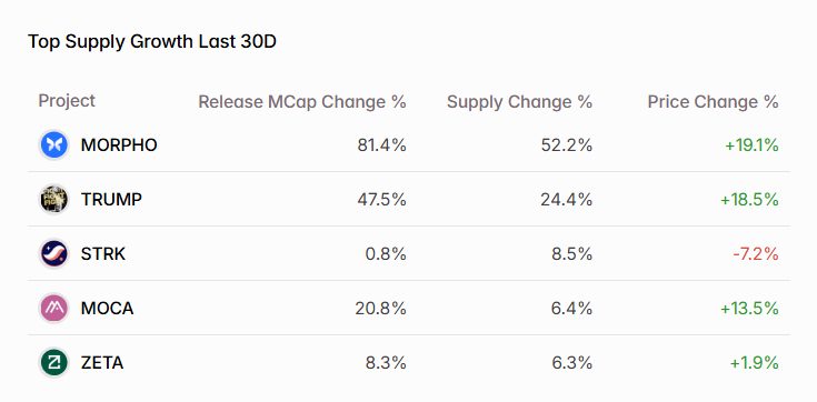 One of the key takeaways this week is the market’s surprisingly resilient response to tokens with the highest circulating supply growth over the past 30 days. Despite substantial unlocks—typically seen as bearish catalysts—prices for several of these tokens have continued to climb. This indicates that current market demand is outpacing the newly introduced supply.