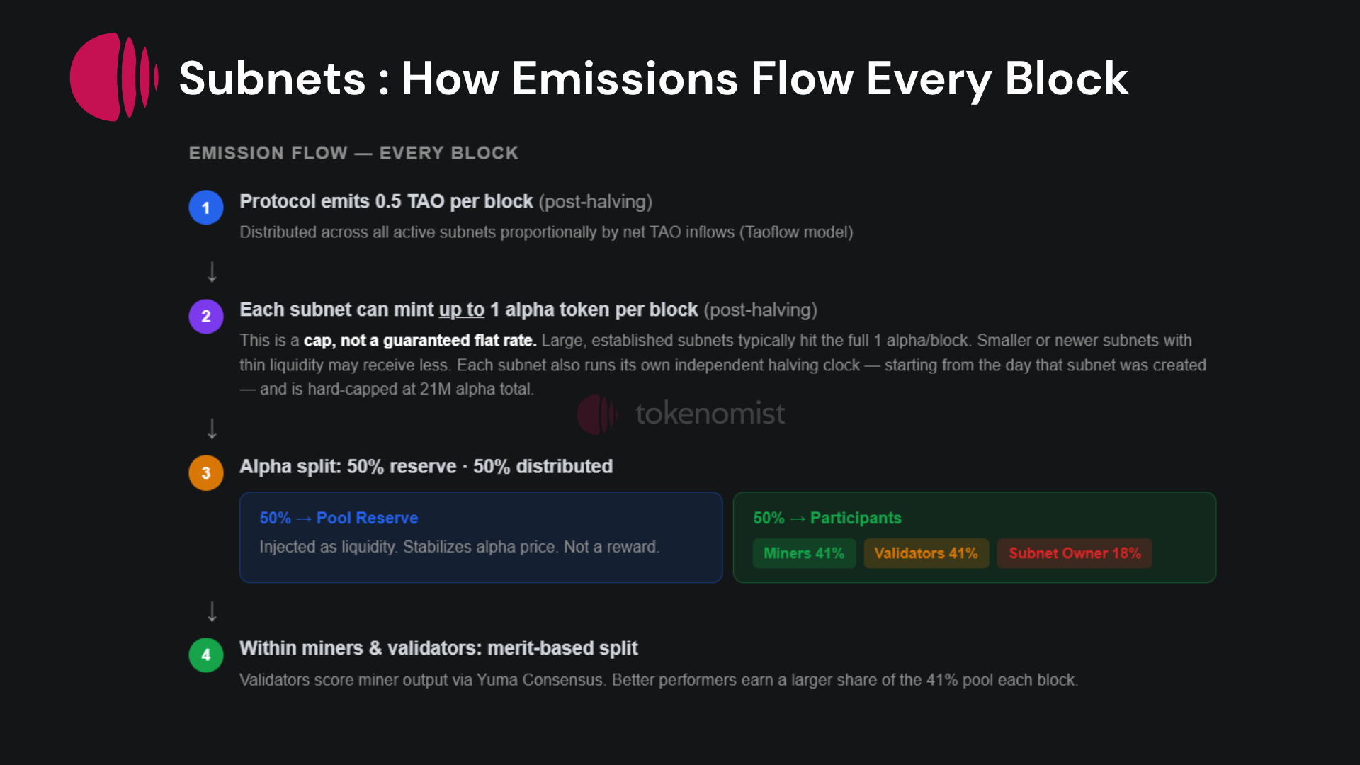Emissions" is just the word for new tokens being released as rewards. Every ~12 seconds (one block), the Bittensor protocol releases new TAO and new alpha tokens and distributes them to participants. Here's exactly what happens: