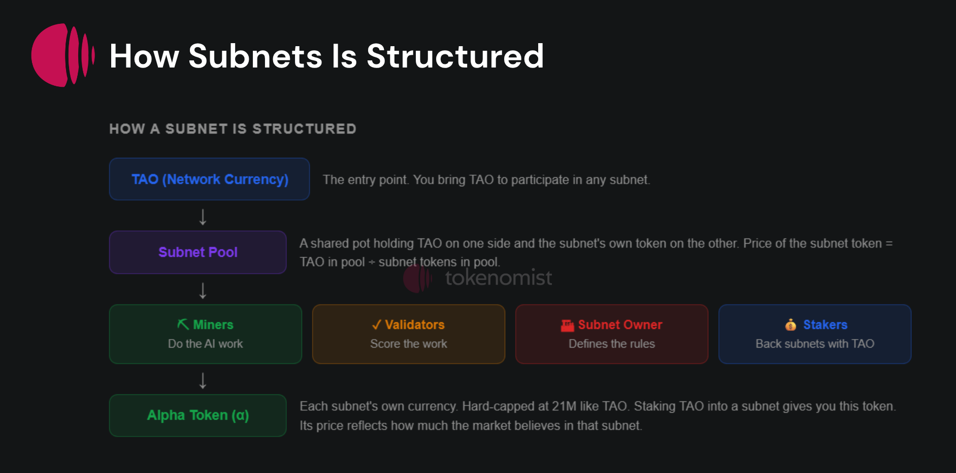 Each subnet is a standalone AI market. One runs GPU inference. Another trains models. Another detects deepfakes. Since February 14, 2025, every subnet has its own alpha token, a subnet-specific currency built on top of TAO.