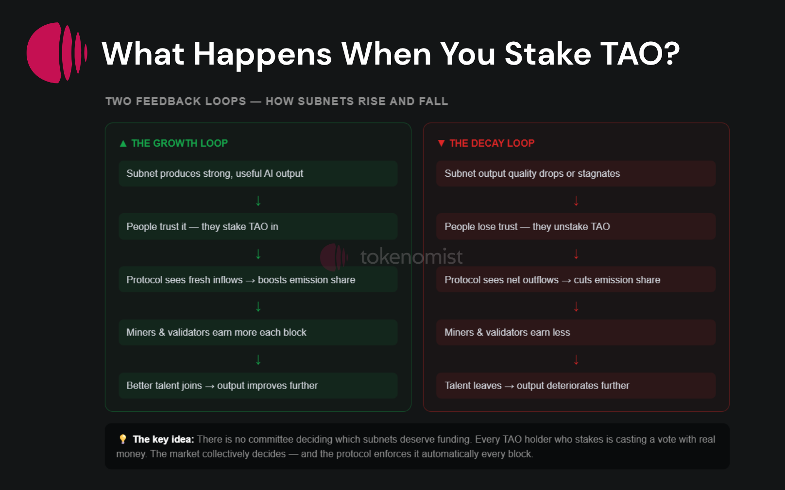 Every TAO staked or unstaked reshapes the emission landscape. It is not a passive deposit, it is a continuous vote.